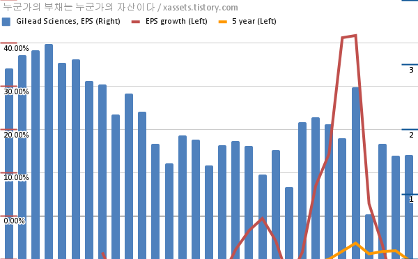 - 포스팅일 기준, 길리어드 사이언스의 1, 5년 연평균 EPS 성장률은 -35.38%, -10.26%이다.