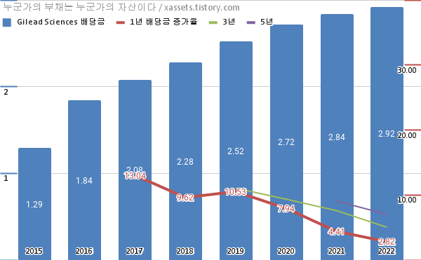 - 길리어드 사이언스의 2022년 기준 1, 3, 5년 연평균 배당성장률은 2.82%, 5.03%, 7.02%이다.