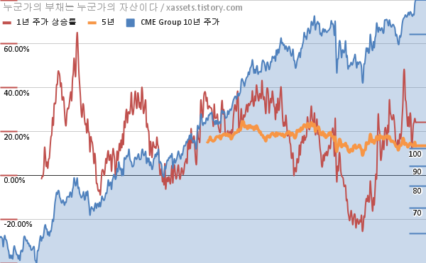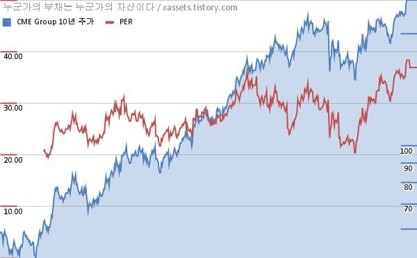 - 포스팅일 기준, 시카고 거래소 그룹의 1, 3, 5, 10년 연평균 주가상승률은 25.96%, 10.60%, 15.17%, 15.15%이다.