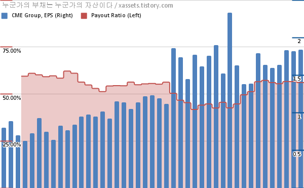 시카고 거래소 그룹 EPS & 성장률, 배당성향 차트 (2012년~2022년)