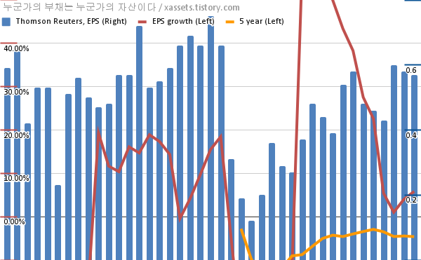 - 포스팅일 기준, 톰슨 로이터의 1, 5년 연평균 EPS 성장률은 5.83%, -4.61%이다.