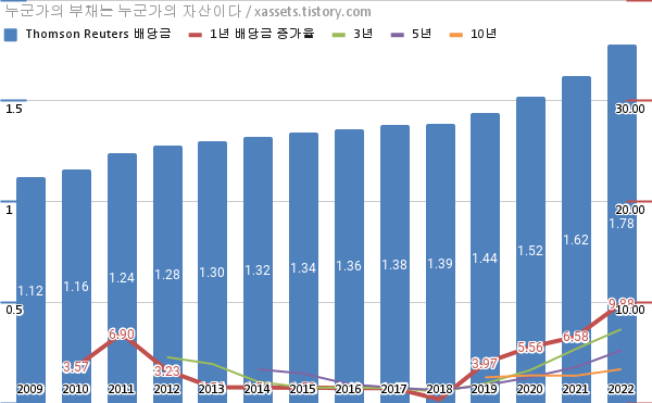 - 톰슨 로이터의 2022년 기준 1, 3, 5, 10년 연평균 배당성장률은 9.88%, 7.32%, 5.22%, 3.35%이다.
