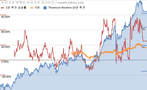 - 포스팅일 기준, 톰슨 로이터의 1, 3, 5, 10년 연평균 주가상승률은 25.22%, 25.62%, 16.68%, 13.46%이다.