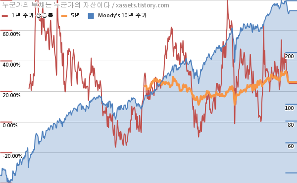 무디스 배당수익률 및 주가 상승률 차트 (2012년~2022년)