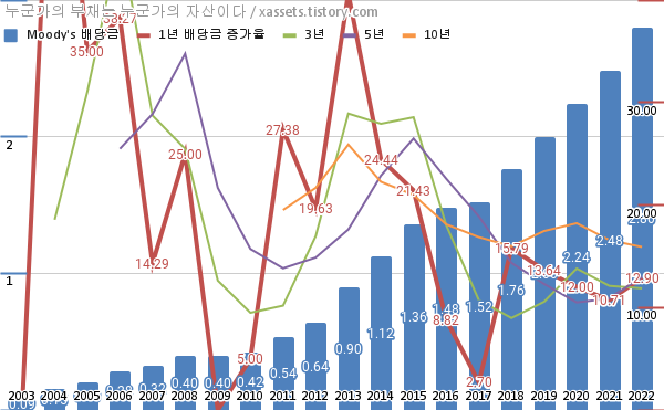 무디스 배당금 및 배당성장률 차트 (2003년~2022년)