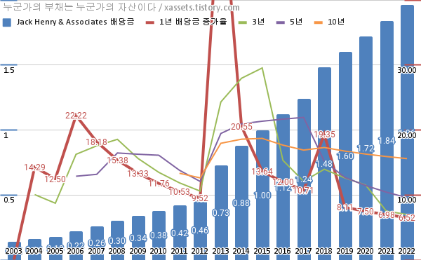 잭 헨리 앤 어소시에이츠 배당금 및 배당성장률 차트 (2003년~2022년)