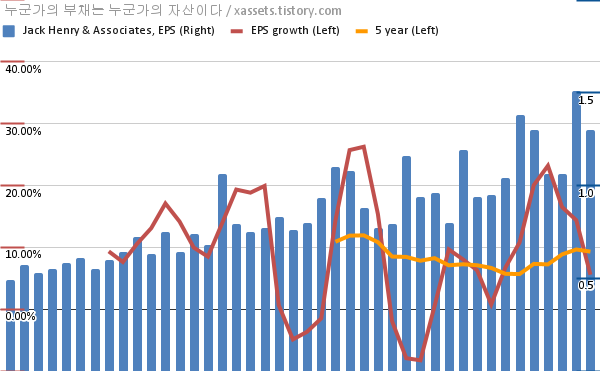 - 포스팅일 기준, 잭 헨리 앤 어소시에이츠의 1, 5년 연평균 EPS 성장률은 5.57%, 9.30%이다.