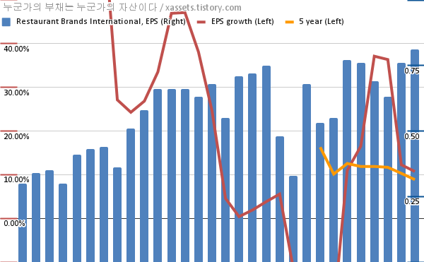 - 포스팅일 기준, 레스토랑 브랜즈의 1, 5년 연평균 EPS 성장률은 10.73%, 8.86%이다.