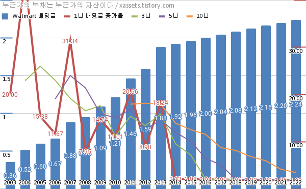 월마트 배당금 및 배당성장률 차트 (2003년~2022년)
