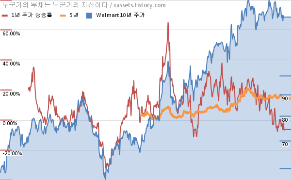 - 포스팅일 기준, 월마트의 1, 3, 5, 10년 연평균 주가상승률은 0.39%, 11.74%, 13.92%, 8.94%이다.