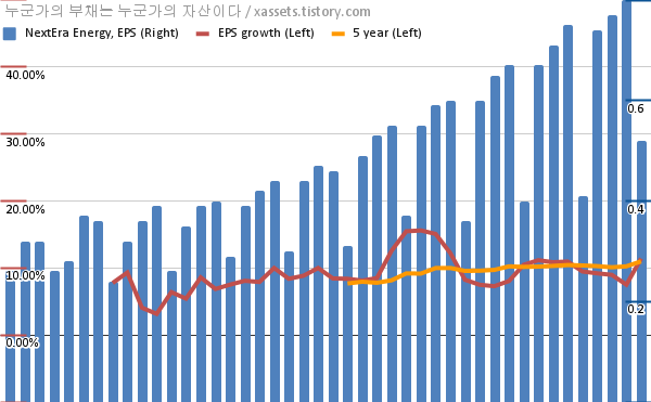- 포스팅일 기준, 넥스테라 에너지의 1, 5년 연평균 EPS 성장률은 11.42%, 10.99%이다.