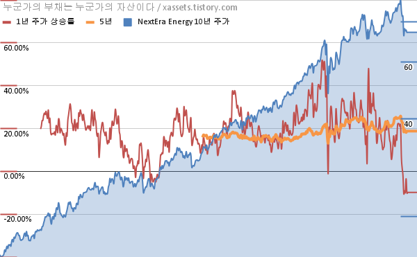 - 포스팅일 기준, 넥스테라 에너지의 1, 3, 5, 10년 연평균 주가상승률은 -3.48%, 17.03%, 18.15%, 17.56%이다.