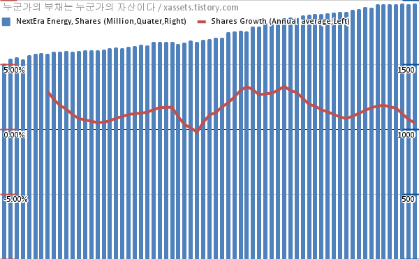 - 최근 우량주들의 일반적인 추세는 자사주 매입으로 주식수가 줄어드는 것인데, 넥스테라 에너지는 주식수가 늘어나고 있다. 일반적으로 투자자에게 좋은 신호는 아니지만, 넥스테라의 경우에는 미래를 위한 투자가 진행되는 중이기 때문에 예외로 보는 게 맞을 것 같다. 위에 EPS와 같이 보면 주식 수가 늘어나는 와중에도 EPS 성장이 안정적이라는 뜻이 된다. 오히려 향후에 투자가 어느 정도 마무리되면 EPS 성장률이 더 높아질 수도 있다고도 볼 수 있다.