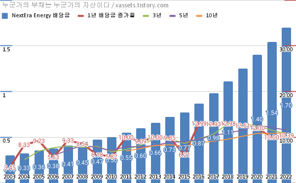 넥스테라 에너지 배당금 및 배당성장률 차트 (2003년~2022년)