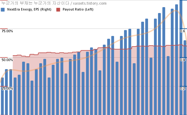 - 넥스테라가 안정적인 배당성장을 할 수 있었던 것은 안정적인 EPS 증가가 있었기 때문이다. 특이한 점은 EPS 성장률과 배당성장률이 거의 같다는 것이다. 꽤 오래 동기화되어 있던 수치라서 당분간은 이어질 것으로 보이며, 만약 변동이 생긴다면 그때는 다른 지표를 포함해서 세세하게 살펴봐야 할 것으로 보인다.