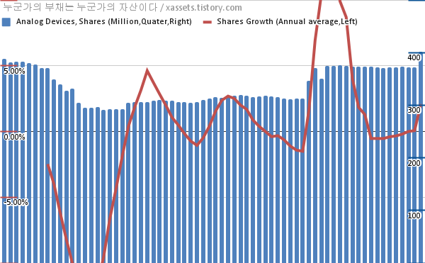 - 아날로그 디바이스는 자사주 매입에 많은 신경을 쓰지 않는 모습이다. 차트를 살펴보면 불연속적인 느낌으로 주식수가 변동되는 구간이 있는데, 미국 주식의 경우 대부분은 M&A에 의한 것이다.