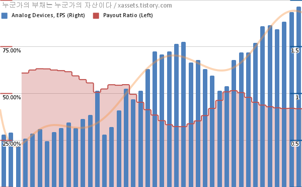 아날로그 디바이스 EPS 성장률, 배당성향 차트 (2012년~2022년)