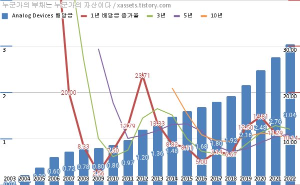 아날로그 디바이스 배당금 및 배당성장률 차트 (2003년~2022년)