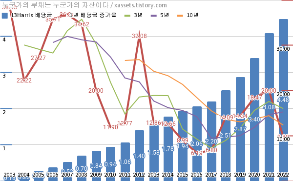 L3해리스 배당금 및 배당성장률 차트 (2003년~2022년)