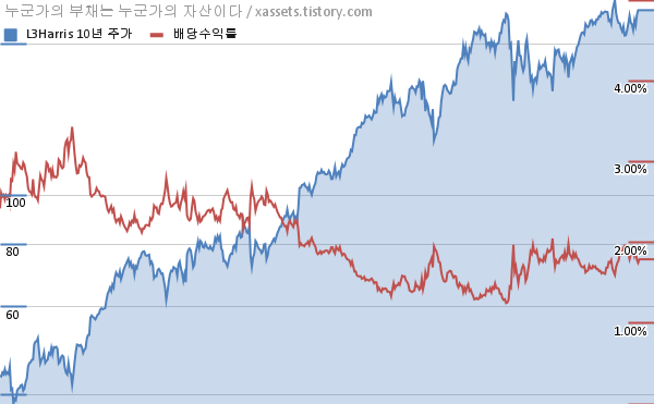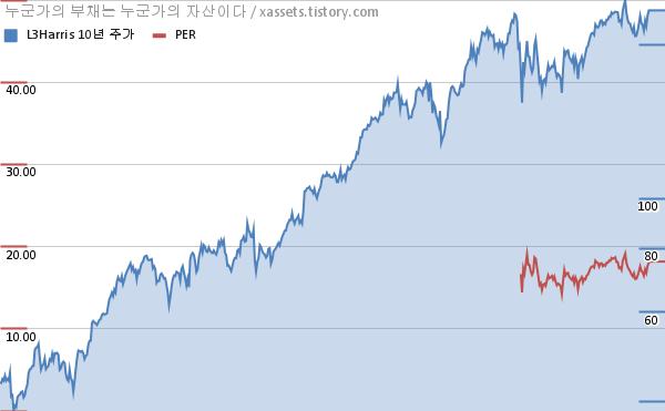 - 포스팅일 기준, L3해리스의 1, 3, 5, 10년 연평균 주가상승률은 25.60%, 11.51%, 15.64%, 18.01%이다.