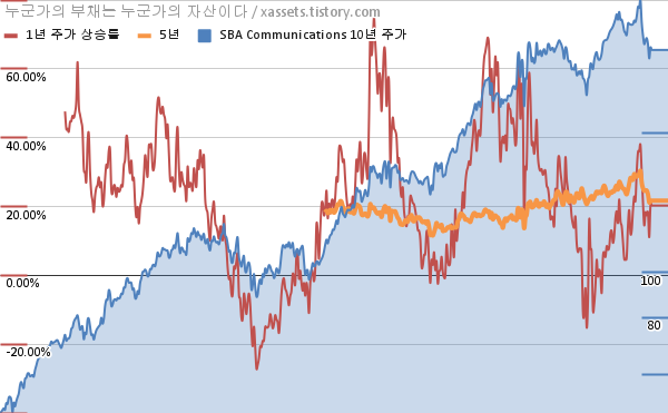 - 포스팅일 기준, SBA 커뮤니케이션스의 1, 3, 5, 10년 연평균 주가상승률은 20.28%, 19.00%, 21.69%, 19.97%이다.