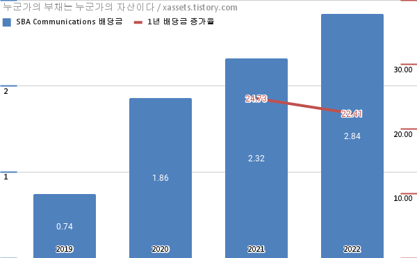 - SBA 커뮤니케이션스의 2022년 기준 1년 연평균 배당성장률은 22.41%이다.