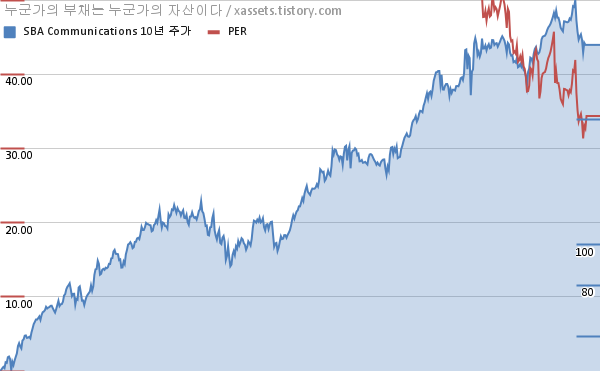 SBA 커뮤니케이션스 PER 차트 (2012년~2022년)