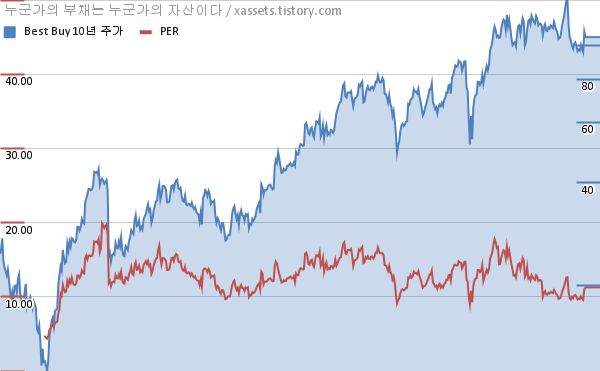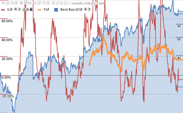 - 포스팅일 기준, 베스트 바이의 1, 3, 5, 10년 연평균 주가상승률은 7.09%, 17.80%, 19.71%, 15.75%이다.