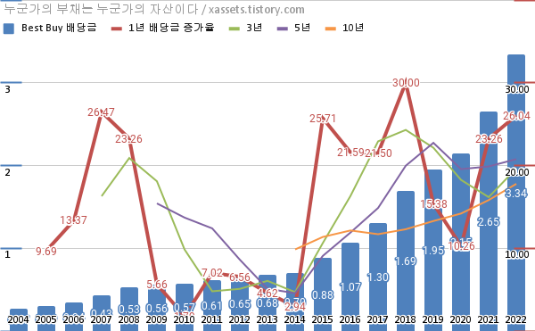 - 베스트 바이의 2022년 기준 1, 3, 5, 10년 연평균 배당성장률은 26.04%, 19.65%, 20.77%, 17.78%이다.