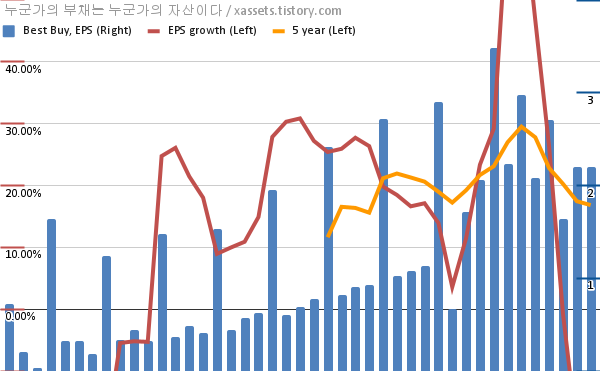 - 포스팅일 기준, 베스트 바이의 1, 5년 연평균 EPS 성장률은 -18.76%, 16.83%이다.
