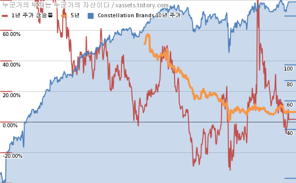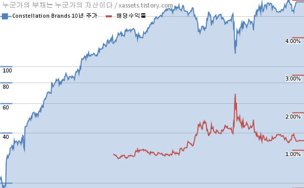 콘스텔레이션 브랜드 배당수익률 및 주가 상승률 차트 (2012년~2022년)