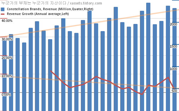 - 포스팅일 기준, 콘스텔레이션 브랜드의 1, 3, 5, 10년 연평균 주가상승률은 8.19%, 8.37%, 7.50%, 27.57%이다.