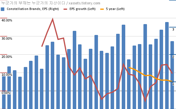 - 포스팅일 기준, 콘스텔레이션 브랜드의 1, 5년 연평균 EPS 성장률은 14.51%, 5.92%이다.