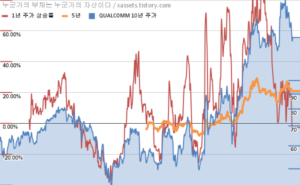 - 포스팅일 기준, 퀄컴의 1, 3, 5, 10년 연평균 주가상승률은 -1.53%, 19.43%, 20.99%, 7.81%이다.