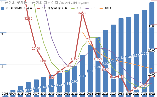 퀄컴 배당금 및 배당성장률 차트 (2003년~2022년)