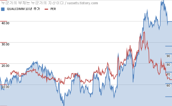 - 퀄컴의 PER은 생각보다 높지 않았고, 잠시 높아진 시점을 제외하고는 변동폭도 그렇게 크지 않다. 최근에는 주가 대비해서 PER이 저점에 가까운 수준이다. 물론 여기에는 함정이 있다. 업종 자체가 경기를 타는 업종이라는 것이다. 과거 패턴을 보면 기간을 두고 실적을 확인해야 함을 알 수 있다.