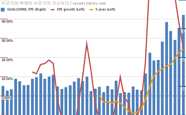 - 포스팅일 기준, 퀄컴의 1, 5년 연평균 EPS 성장률은 25.42%, 24.22%이다.