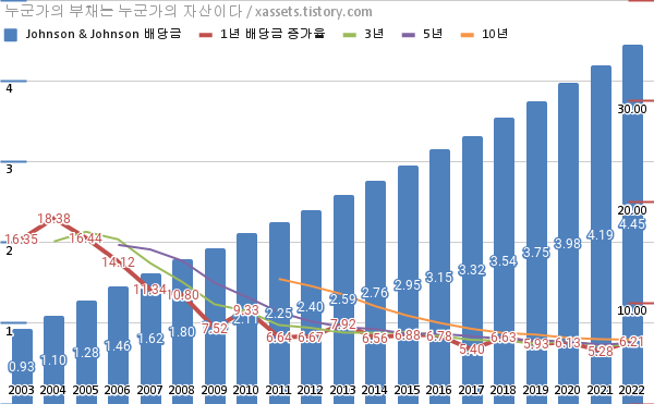 존슨앤존슨 배당금 및 배당성장률 차트 (2003년~2022년)