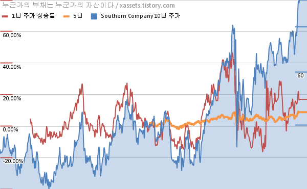 - 포스팅일 기준, 서던 컴퍼니의 1, 3, 5, 10년 연평균 주가상승률은 16.89%, 13.51%, 8.74%, 5.15%이다.