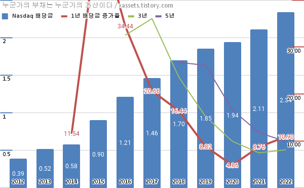 나스닥 배당금 및 배당성장률 차트 (2012년~2022년)
