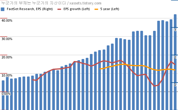 - 포스팅일 기준, 팩트셋 리서치의 1, 5년 연평균 EPS 성장률은 14.69%, 11.79%이다.