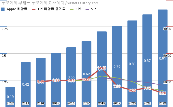애플 배당금 및 배당성장률 차트 (2012년~2022년)