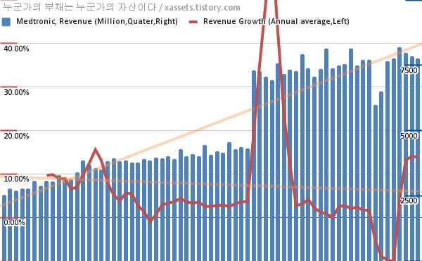 메드트로닉 매출 성장률 차트 (2005년~2022년)