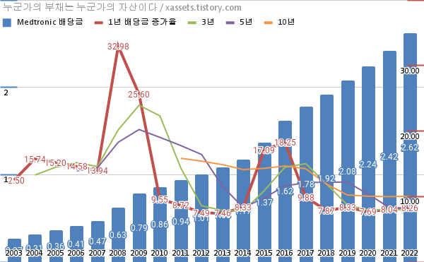 메드트로닉 배당금 및 배당성장률 차트 (2003년~2022년)