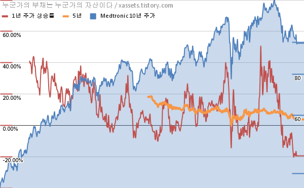 - 포스팅일 기준, 메드트로닉의 1, 3, 5, 10년 연평균 주가상승률은 -19.45%, 3.29%, 3.80%, 11.00%이다.