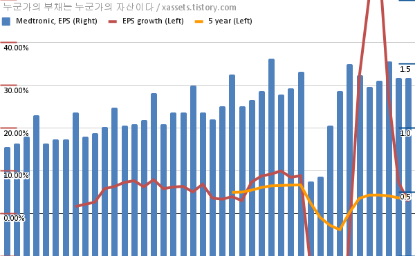 - 포스팅일 기준, 메드트로닉의 1, 5년 연평균 EPS 성장률은 2.72%, 4.09%이다.