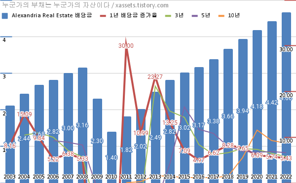 알렉산드리아 부동산 배당금 및 배당성장률 차트 (2003년~2022년)