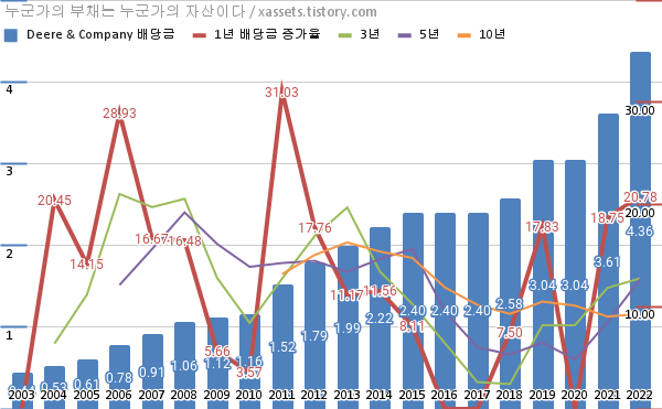 디어 & 컴퍼니 배당금 및 배당성장률 차트 (2003년~2022년)