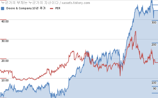 - 포스팅일 기준, 디어 & 컴퍼니의 1, 3, 5, 10년 연평균 주가상승률은 -0.10%, 37.04%, 23.63%, 17.12%이다.