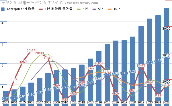 캐터필러 배당금 및 배당성장률 차트 (2003년~2022년)